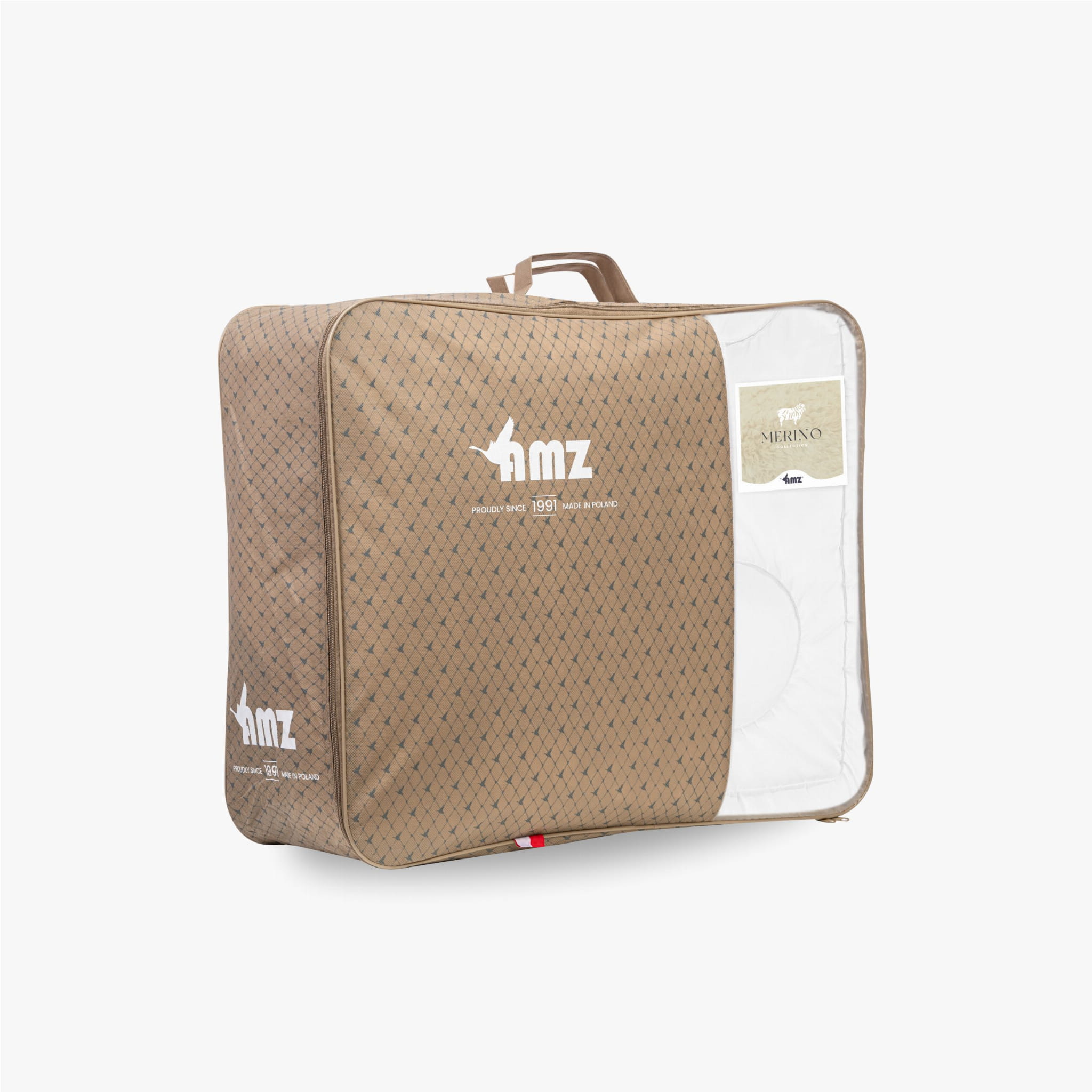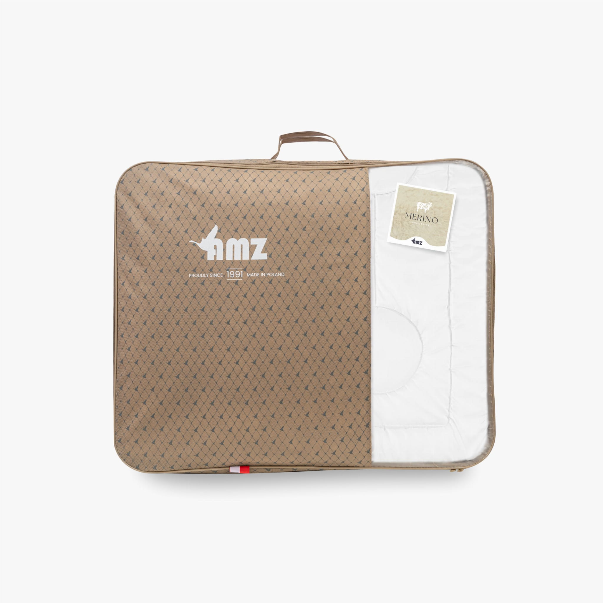 Opakowanie: kołdry z kolekcji AMZ Merino zapakowane są w eleganckie torby, które poza walorami estetycznymi przede wszystkim zabezpieczają kołdrę podczas przechowywania oraz transportu.