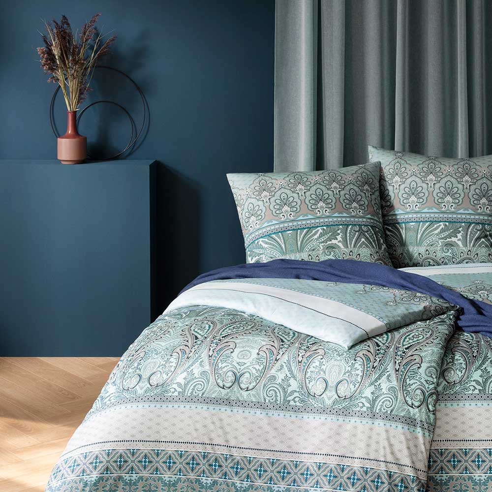 Kolor prześcieradła: 051 - cyan, 080 - jade. Jest to sugerowany przez producenta kolor prześcieradła marki Estella najbardziej pasujący do kompletu pościel.